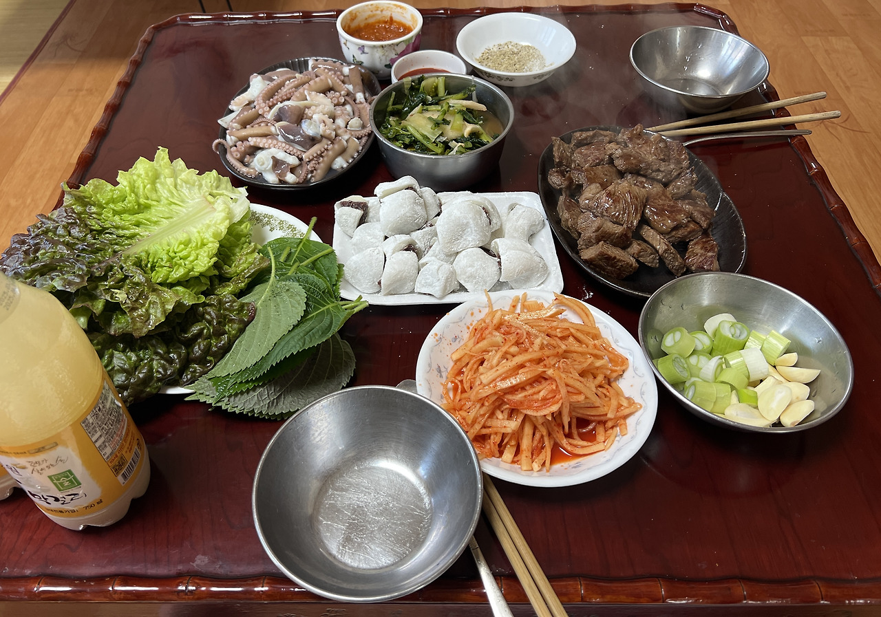 한우등심, 낙지, 찹쌀떡, 막걸리 ㅎㅎㅎ