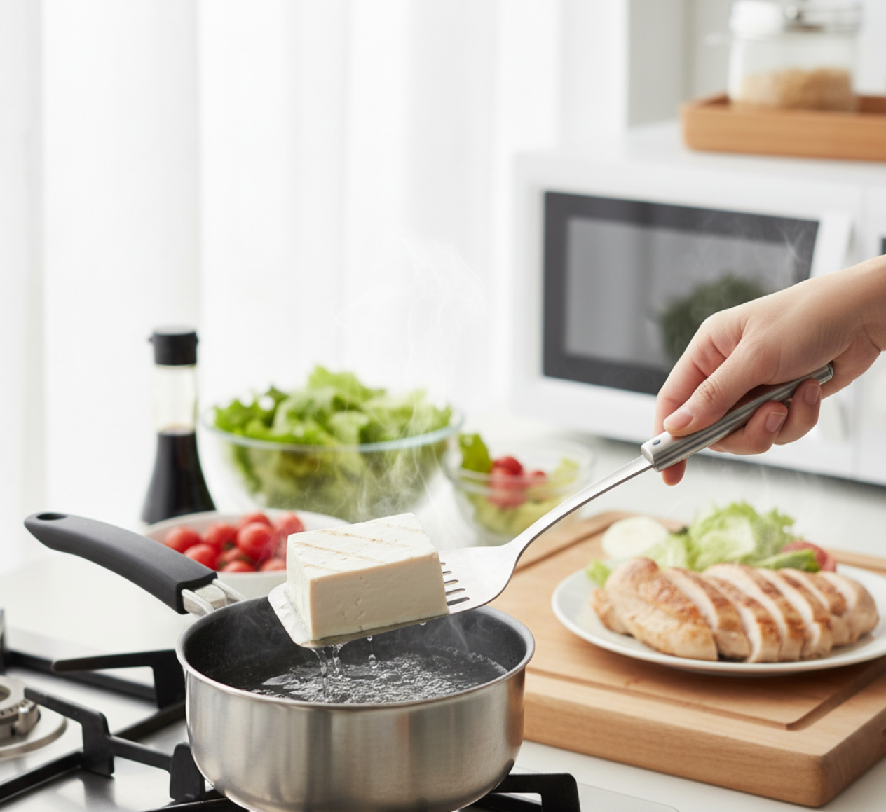 - 닭가슴살은 전자레인지 2분, 두부는 데쳐서 물기 제거